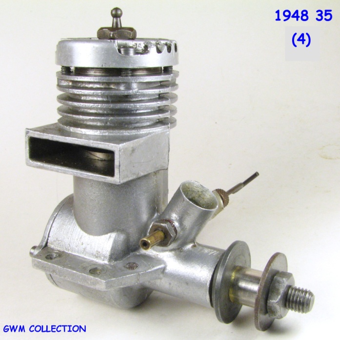 One of the most famous model airplane engines ever made, the Fox 35 Stunt originated in 1948 (4). Universally called Sandcast engines, the first 35's were actually cast in ferrous permanent molds. The first 35 was made by Fox Engineering Labs (Duke Foxs garage). It had as-cast cylinder fins, head bolt bosses between the top 2 cylinder fins, 4 bolt head, 2 bolt rear cover, and no web between the venturi and the cylinder. A universal Austincraft NVA was used.